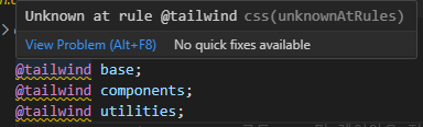 CSS 확장자 파일에 작성한 내용인데 CSS에는 @tailwind라는 문법이 없기 때문에 발생하는 경고 메시지이다.