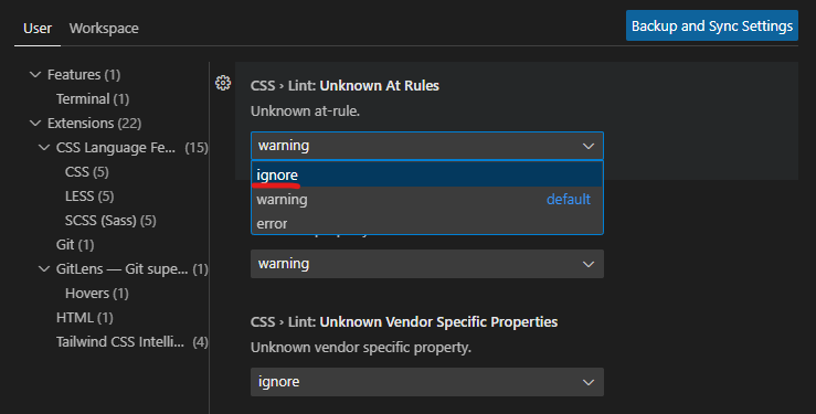 vscode의 settings.json의 CSS Lint:Unknown At Rules 설정을 바꿔준다.